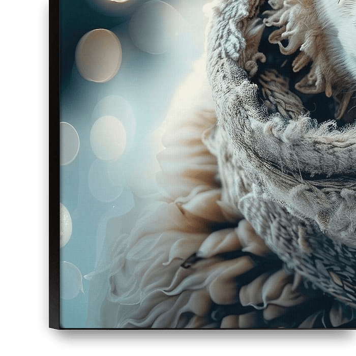 Das Porträt eines Schafes, das direkt in die Kamera blickt und in ein Tuch eingewickelt ist. Das Schaf steht im Mittelpunkt des Bildes, während der Hintergrund mit Lichtpunkten gefüllt ist, die eine friedliche Atmosphäre schaffen.
