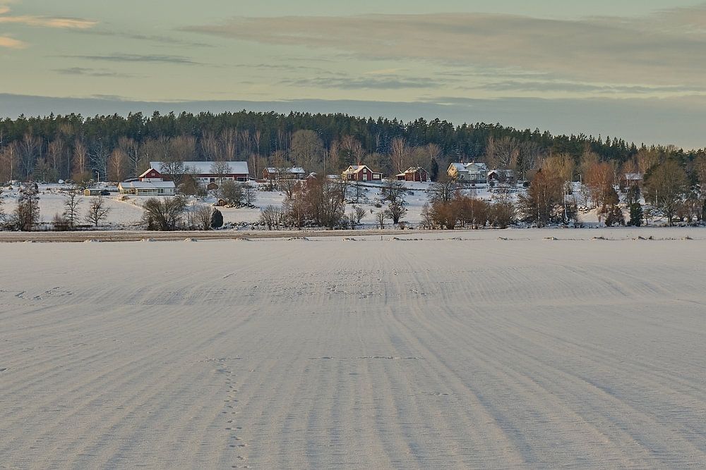 Winterlandschaft in Schweden mit einem Torpedo in der Ferne auf den sanften Hügeln