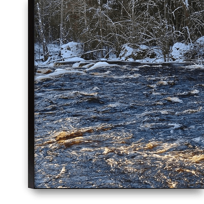Winter Schweden Fluss Emån fließt wild mit im Hintergrund und schneebedeckten Ufern und und blauem Himmel