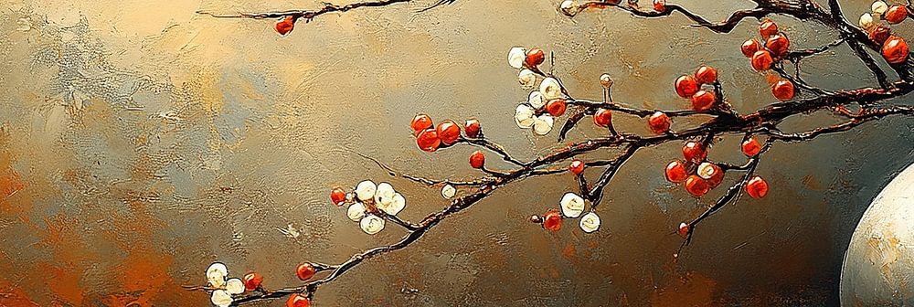 Wintervase - Dieses Stillleben zeigt eine schwerfällige, graue Keramikvase mit einer üppigen Ansammlung von Zweigen mit roten Beeren und weißen Blüten, die auf einer rustikalen Oberfläche vor einem Hintergrund aus warmen, erdigen Tönen platziert sind, die eine ruhige und gemütliche Winteratmosphäre ausstrahlen.