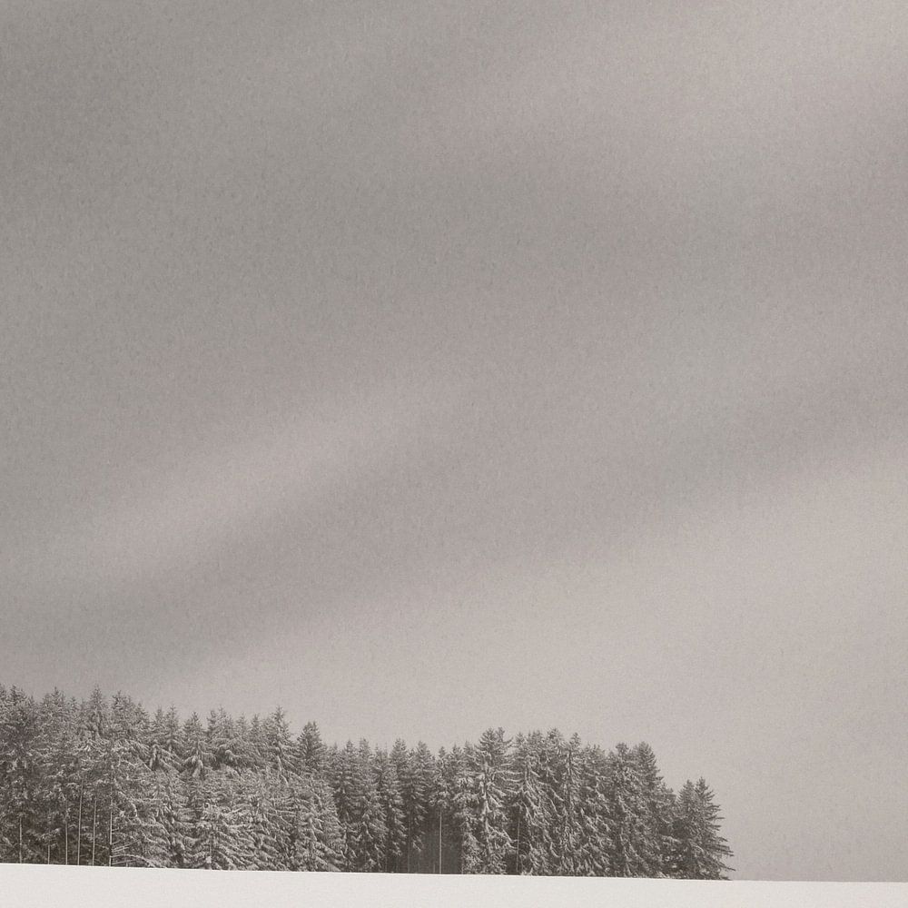 Fotografie einer winterlichen Landschaft mit einem kleinen Wald im minimalistischen Stil in schwarz-weiß, getönt.