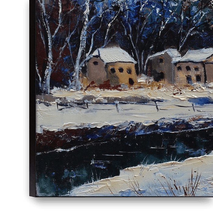 Bestelle dieses Landschafts-Wandbild Winter am Fluss von pol ledent als Reproduktion auf Leinwand, Alu-Dibond, als Poster, Fototapete oder Acrylglasbild.