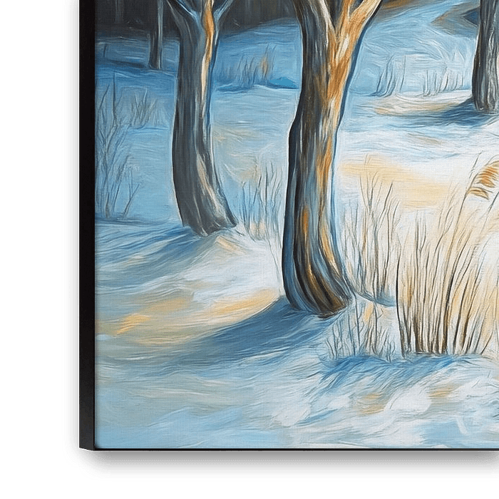 Eine friedvolle Winterszene zeigt eine verschneite Meereslandschaft unter einem leuchtenden Mondhimmel. Kahle Bäume säumen elegant das Ufer, während sanfte Schneeflocken herabrieseln.