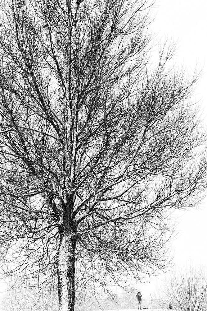 Een winterse dag in februari, net gevallen sneeuw geeft een sprookjesachtig beeld. Omgezet naar zwart-wit.