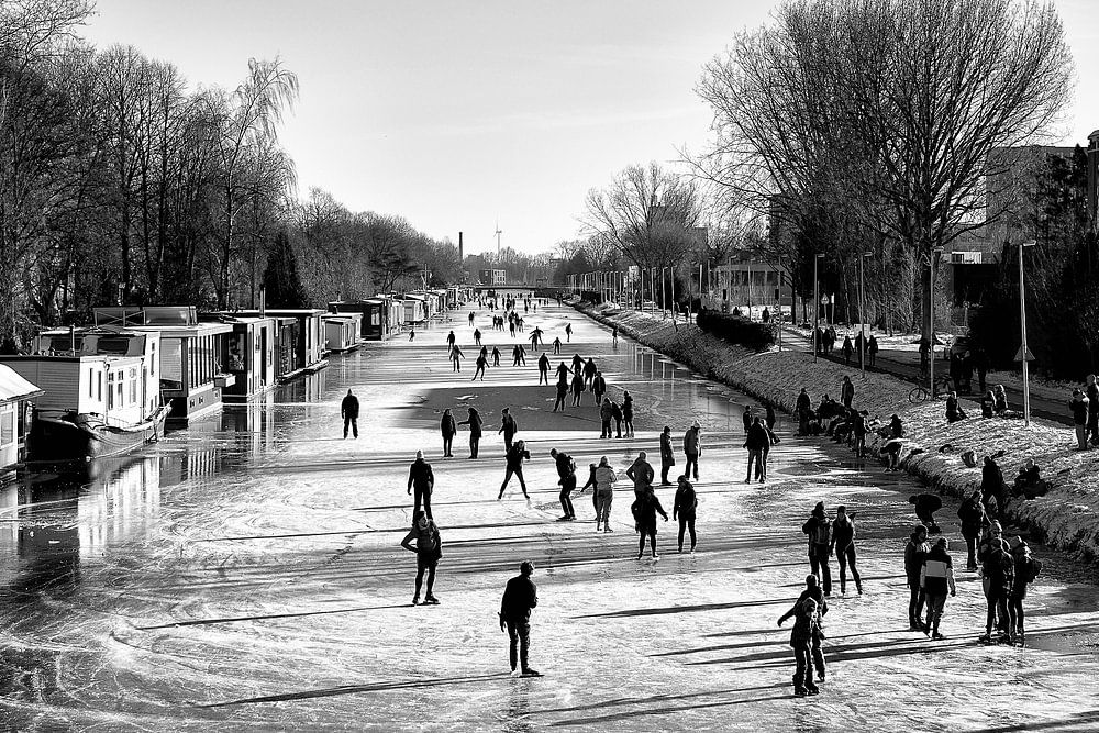 Winter in Utrecht. Schlittschuhlaufen auf dem Merwedekanaal am 13. Februar 2021. Das Foto wurde vom Utrechter Fotografen André Blom aufgenommen und ist Teil seines Langzeit-Fotoprojekts 'The Utrecht Canals'.