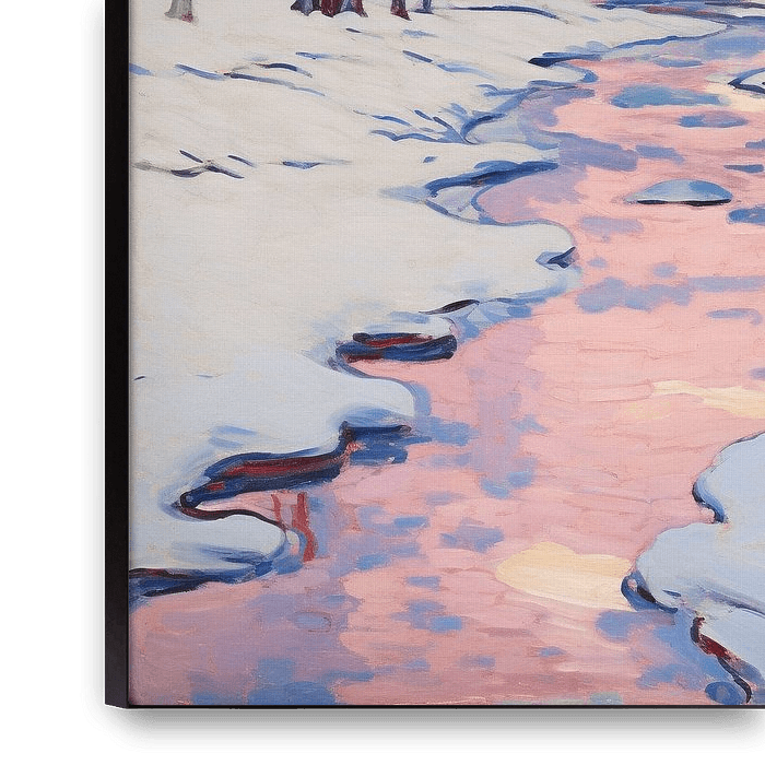 Winter Pink - Eine verträumte Landschaft, in der die untergehende Sonne ein rosafarbenes Licht über einen verschneiten Wald und einen Fluss wirft. Der Stil hat einen impressionistischen Touch mit weichen Pinselstrichen und einer beruhigenden Farbpalette von kühlen Blautönen bis zu warmen Rosatönen, Gelb und Weiß.
