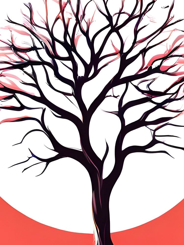 Eine strenge und eindrucksvolle Darstellung eines kahlen Baumes vor einem kontrastreichen Hintergrund. Das verschlungene Geflecht der Äste reicht bis zum Himmel, ein zartes schwarzes Filigran vor einem großen, weichen weißen Kreis, der den Mond oder die untergehende Sonne darstellen könnte. Unten spiegeln die Wurzeln die oberen Äste wider und verankern den Baum in der dunklen Erde. Der Gesamteindruck ist der einer ruhigen Stille und der schlichten Schönheit der Natur in ihrem Ruhezustand.