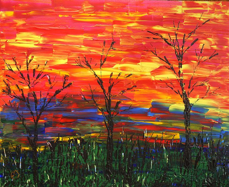Der Himmel färbt sich an einem Winterabend leuchtend rot und orange, mit der Silhouette einiger Bäume im Vordergrund