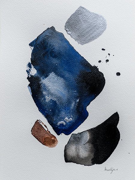 Abstrakte Arbeiten in kühlen Blau- und Schwarztönen, schimmerndem Silber und warmem Terra. Die kühlen und warmen Farben sorgen für Kontrast – als dürfe man sich nach einem Eisbad an ein warmes Lagerfeuer setzen. Die Komposition ist verspielt – es herrscht Ausgewogenheit, obwohl jede Form asymmetrisch ist. Das Werk ist inspiriert von…