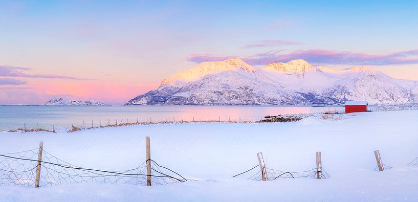 Goldene Stunde in Nordnorwegen, wenn die Sonne gerade die Gipfel der Berge in der Ferne erhellt. Die Sonne verleiht der Landschaft ein rosa Licht. Es ist Winter und die Landschaft ist mit einer dicken Schneedecke bedeckt. Es gibt ein rotes Haus am Rande des Meeres.