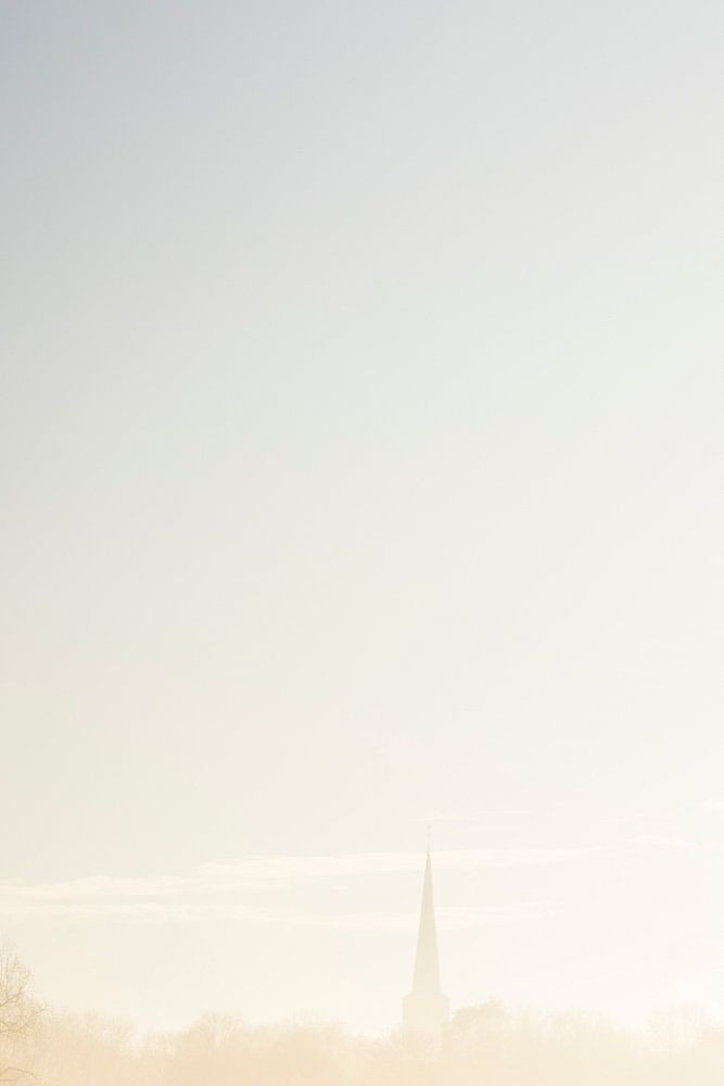 Das Bild zeigt ein Feld mit einem Zaun im Vordergrund und einer Kirche im Hintergrund. Das Feld ist mit Schnee und Eis bedeckt, und die Kirche ist von Bäumen umgeben. Der Himmel ist grau und es herrscht ein leichter Nebel.
