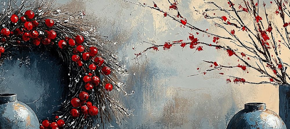Winter Berries - Dieses Weihnachtsgemälde zeigt eine realistische Darstellung von roten Beeren und Zweigen in Vasen und einen Weihnachtskranz vor einem weichen, grauen Hintergrund, der durch den Kontrast zwischen roten und dunklen Tönen ein warmes, winterliches Gefühl vermittelt.