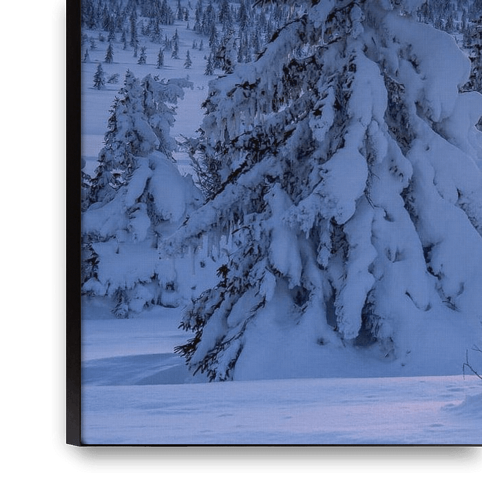 Ein Sonnenuntergang in Norwegen im Winter mit bunten Wolken. Im Vordergrund stehen Nadelbäume, die von einer dicken Schneedecke bedeckt sind. Es ist ein Blick über ein Bergplateau.