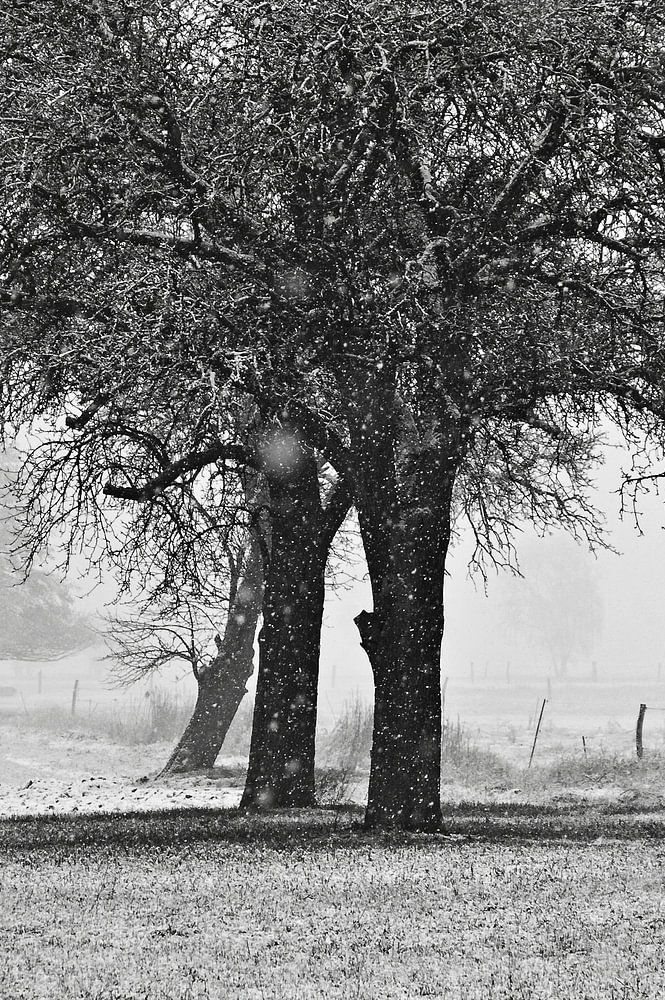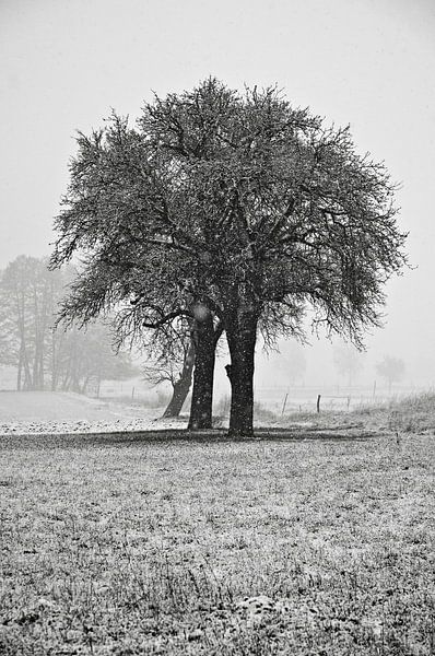 Winterlicher, schneebedeckter Acker mit Baum im Oderbruch - monochrom von Silva Wischeropp