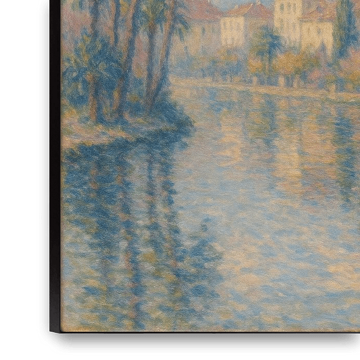 "Winterlicht in Meran" ist eine stimmungsvolle Neuinterpretation einer einzigartigen alpinen Umgebung, in der schneebedeckte Berge auf palmengesäumte Flussufer treffen und sich mediterraner Charme mit hochalpiner Klarheit vermischt. Mit einer von Monet inspirierten Palette aus Pastellblau, zartem Grün, blassem Pfirsich und strahlendem…