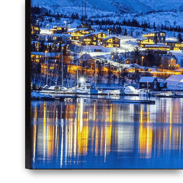 Dieses Foto habe ich während einer unvergesslichen Reise nach Norwegen im Winter 2020 aufgenommen. Was Sie sehen, ist ein kleines, stimmungsvolles Dorf oberhalb von Tromsø, versteckt zwischen schneebedeckten Bergen und an einem ruhigen Fjord. Die hell erleuchteten Häuser scheinen fast gegen das tiefe Blau der skandinavischen Winternacht…