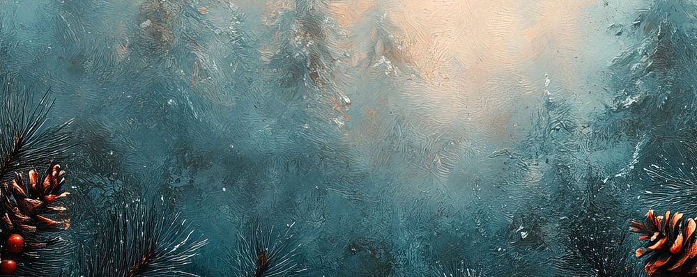 Winterpracht | Stimmungsvolles Weihnachtswaldgemälde - Dieses Weihnachtsgemälde zeigt eine lebendige und stimmungsvolle Darstellung von roten Kugeln und Tannenzapfen zwischen den dunkelgrünen Zweigen eines Weihnachtsbaums, vor einer nebligen, blaugrauen Winterlandschaft im Hintergrund.