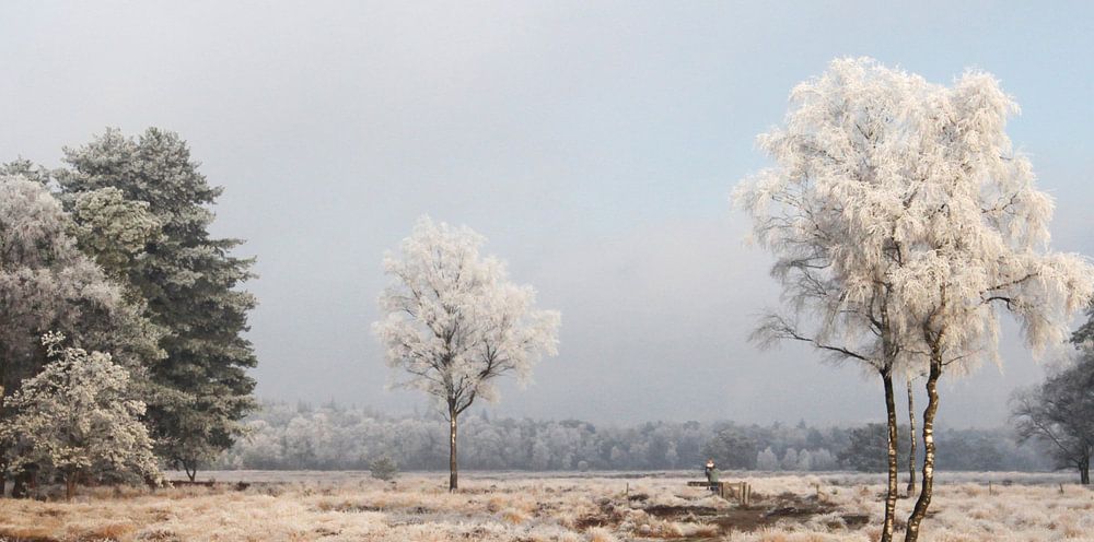 Panoramafoto op de grens van het Leersumse Veld en Breeveen in Utrecht. Een zonnige, rustige, iets nevelige dag met veel rijp op de heide en op de bomen.