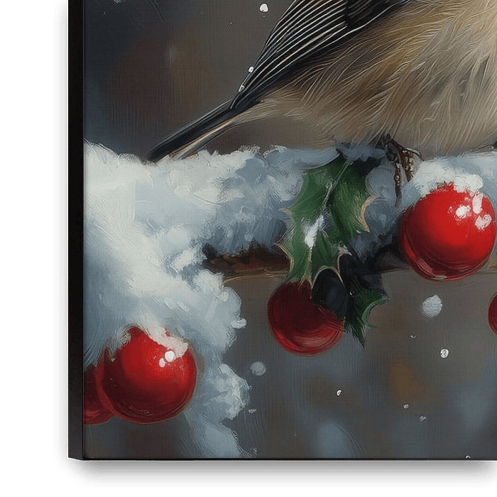 Winter Birds in Red" ist ein bezauberndes und festliches Bild von drei kleinen Vögeln, jeder mit einer roten Strickmütze und einem roten Schal bekleidet. Die Vögel sitzen auf einem schneebedeckten Zweig, der mit leuchtend roten Beeren geschmückt ist, und scheinen bereit für einen Wintertag voller Schneespaß. Ihr flauschiges…