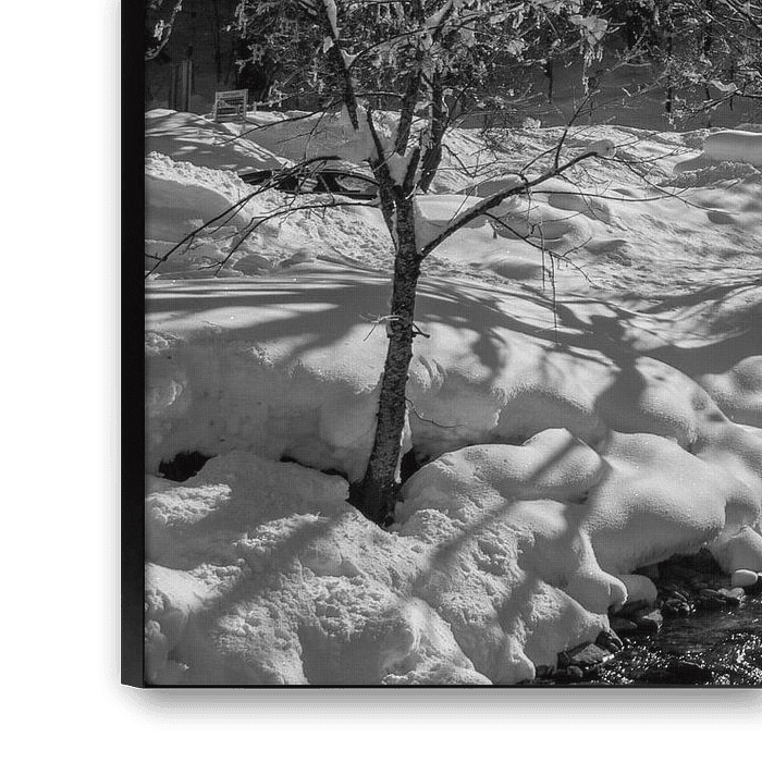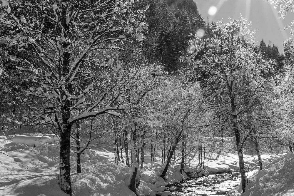 Winterzauber in Untertauern mit der Taurach in schwarz weiß