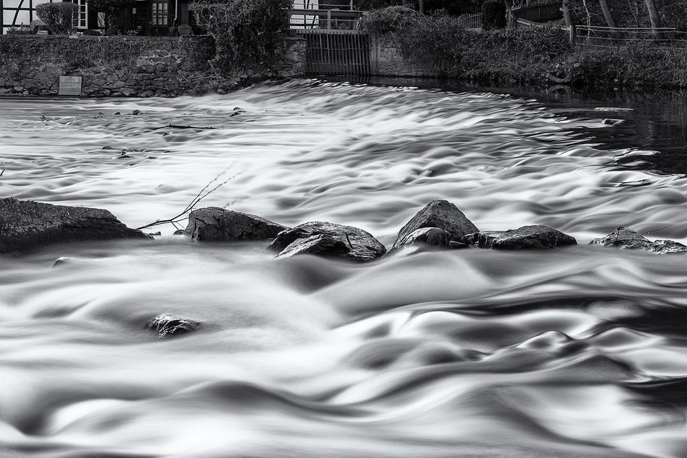 Long Exposure Panoramabild des Wipperkotten an der Wupper bei Solingen bei Sonnenuntergang, Bergisches Land, Deutschland