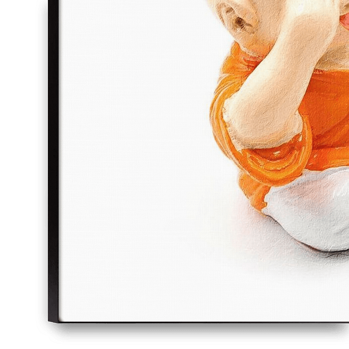 In einem stillen, fast asketischen Raum entfaltet sich eine humorvolle Szene wie in einer leicht pastosen Malweise, von symbolischer Dichte. Drei witzige, buddhistische Mönche, in leuchtend orangene Gewänder gehüllt, sitzen im Kreis – eine Anordnung, die Gemeinschaft, Meditation und den Kreislauf des Lebens evoziert. Im Zentrum dieses…