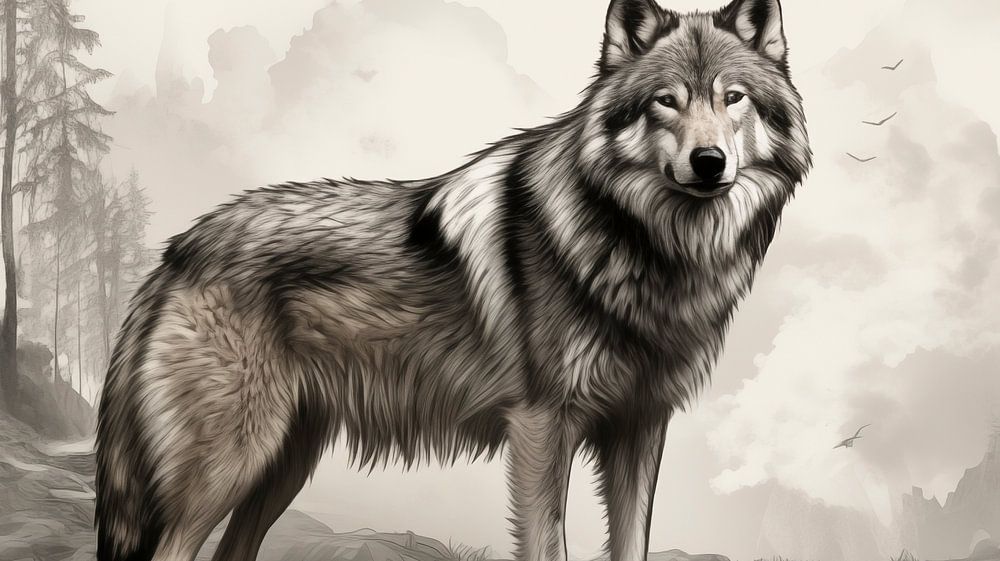 Wolf im Wald , Bleistift Zeichnung Vintage.