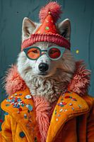 Ein Wolf in Partykleidung mit Geburtstagshut und einer Torte feiert sichtlich vergnügt im Studio.