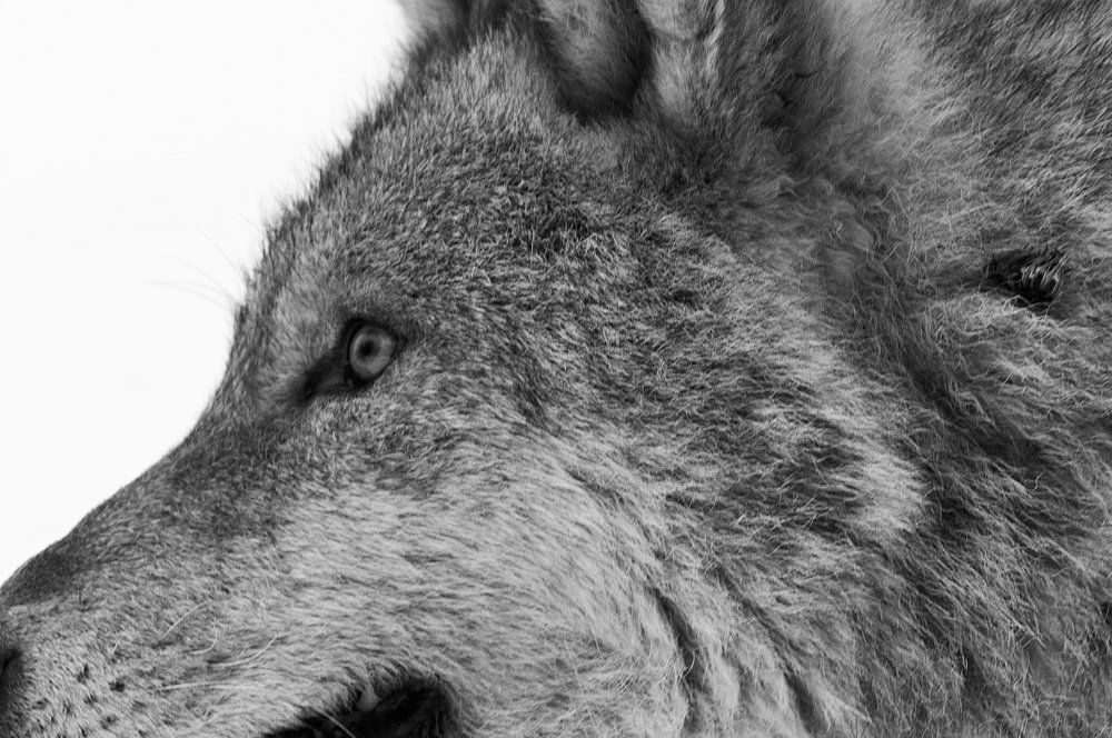 Kop van een mannetjeswolf in Wit-Rusland, gefotografeerd in de wintersneeuw