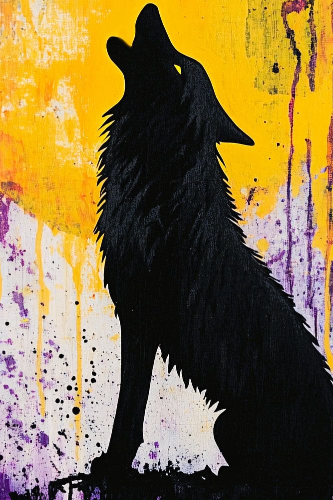 Ein kraftvolles Design, das die Silhouette eines Wolfs zeigt, der einen hellen, gelben Vollmond anheult. Die ausdrucksstarke Verwendung von Lila und Gelb, kombiniert mit schwarzen und weißen Akzenten, macht dieses Kunstwerk zu einer dynamischen und faszinierenden Ergänzung für jedes Interieur. Dieses Gemälde ist ideal für Liebhaber der Natur und der abstrakten Kunst und bringt Energie und Mysterium in Ihren Raum. Perfekt für ein Schlafzimmer, ein Büro oder ein modernes Wohnzimmer.