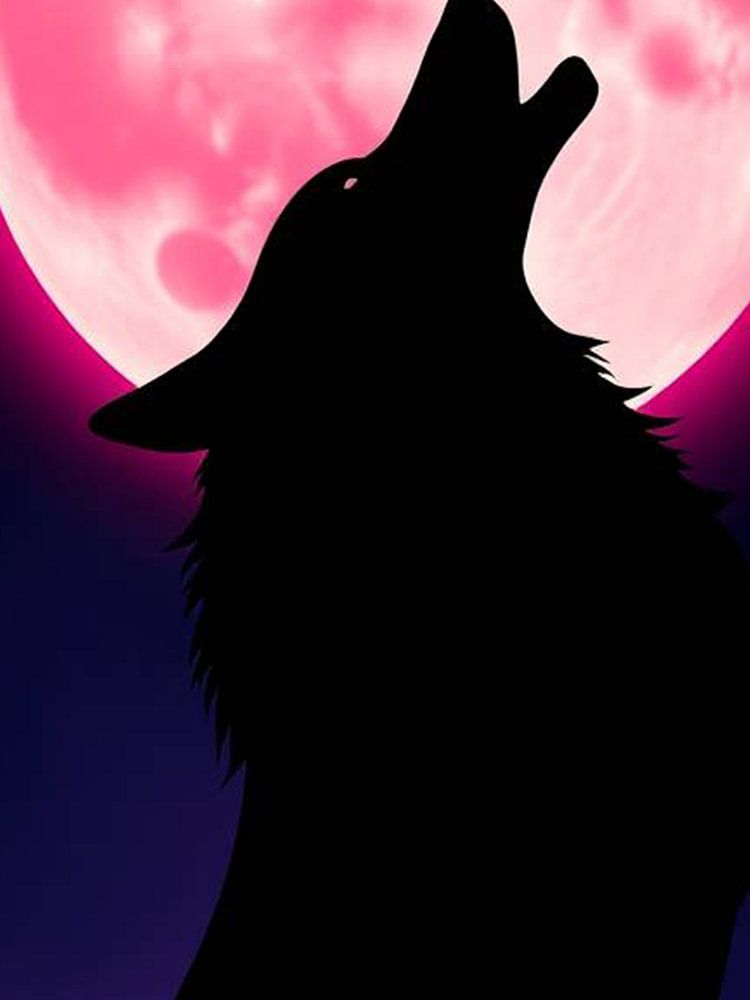 Eine minimalistische und dramatische Illustration einer Wolfs- oder Fuchs-Silhouette, die vor einem großen, auffallend roten oder orangefarbenen Vollmond bei Nacht heult.