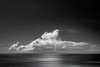 Eine große weiße Wolke dominiert den Himmel über einem glatten, spiegelnden Ozean. Die ruhige und minimalistische Monochromie schafft eine friedliche Atmosphäre.