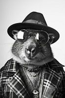 Ein Wombat in einem stilvollen Outfit und Accessoires posiert für ein schwarz-weiß Porträt. Perfekt für kreative und humorvolle Projekte.