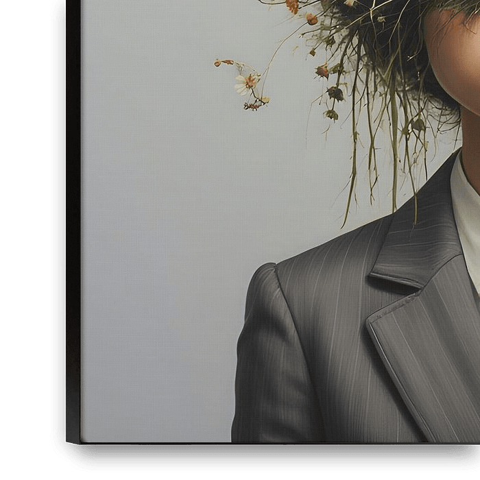 Dieses surreale Porträt zeigt eine junge Frau, deren Kopf von einem bunten, chaotischen Strauß Wildblumen verdeckt wird. Der Kontrast zwischen ihrem formellen Anzug und dem wilden, organischen Wuchs lässt auf einen Geist schließen, der vor Kreativität und Natur strotzt und sich hinter einem konventionellen Äußeren verbirgt. Die zarten…