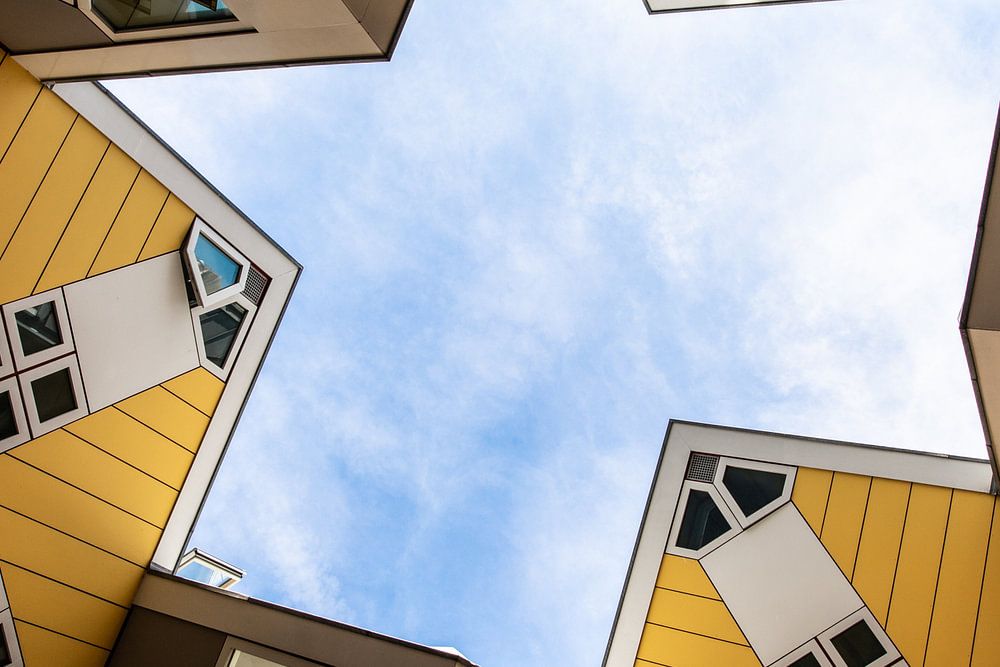 Die besonderssten Häuser in Rotterdam sind die Würfelhäuser. Das Foto wurde von unten nach oben aufgenommen, was einen ganz besonderen Effekt ergibt. Ein echtes Schmuckstück für die Wand.