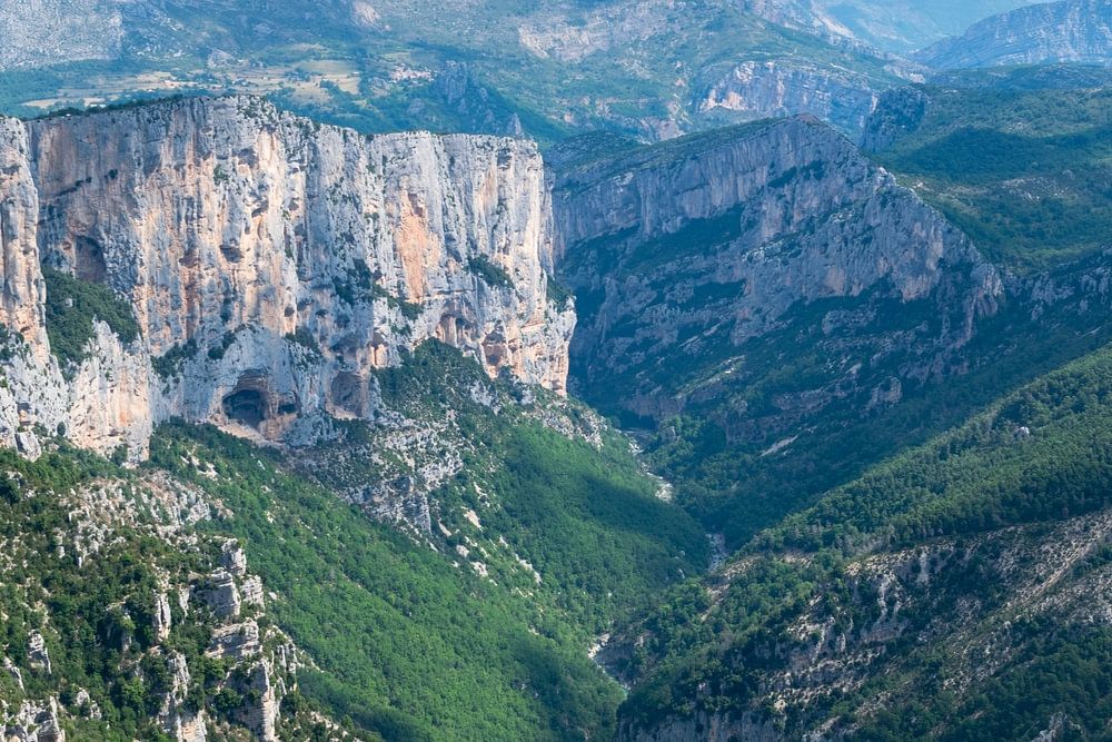 Dieses Foto zeigt eine tolle Aussicht auf die Gorges du Verdon in Frankreich. Diese wunderschöne Schlucht ist sehr grün mit schroffen Bergen und Felsen. Dieses Foto ist sehr schön mit den Bergen im Hintergrund in der Ferne und dem blauen Wasser in der Schlucht.