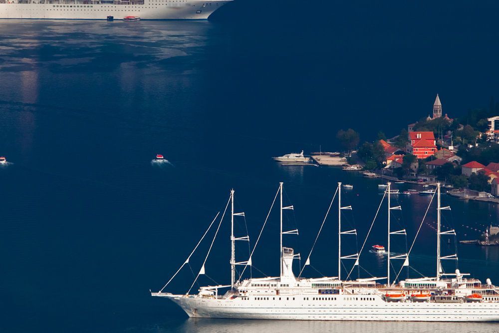 Wunderschöne Kreuzfahrtschiffe (eines davon segelt) liegen weit unten zwischen den dunkelblauen in der Nähe der Stadt mit den roten Dächern, Montenegro Kotor
