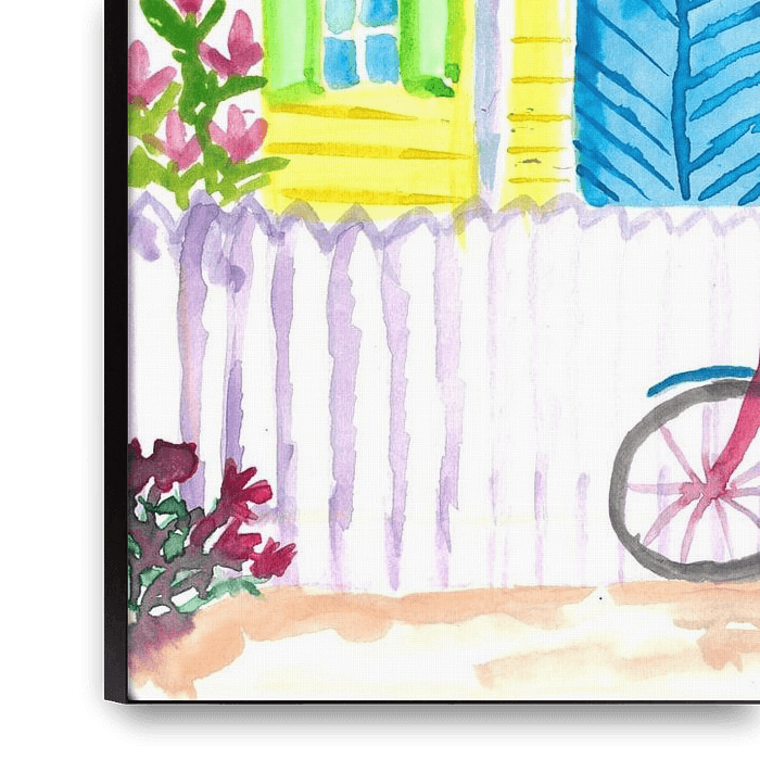 Yellow Conch House Tropical Street Scene With Bike and Rooster