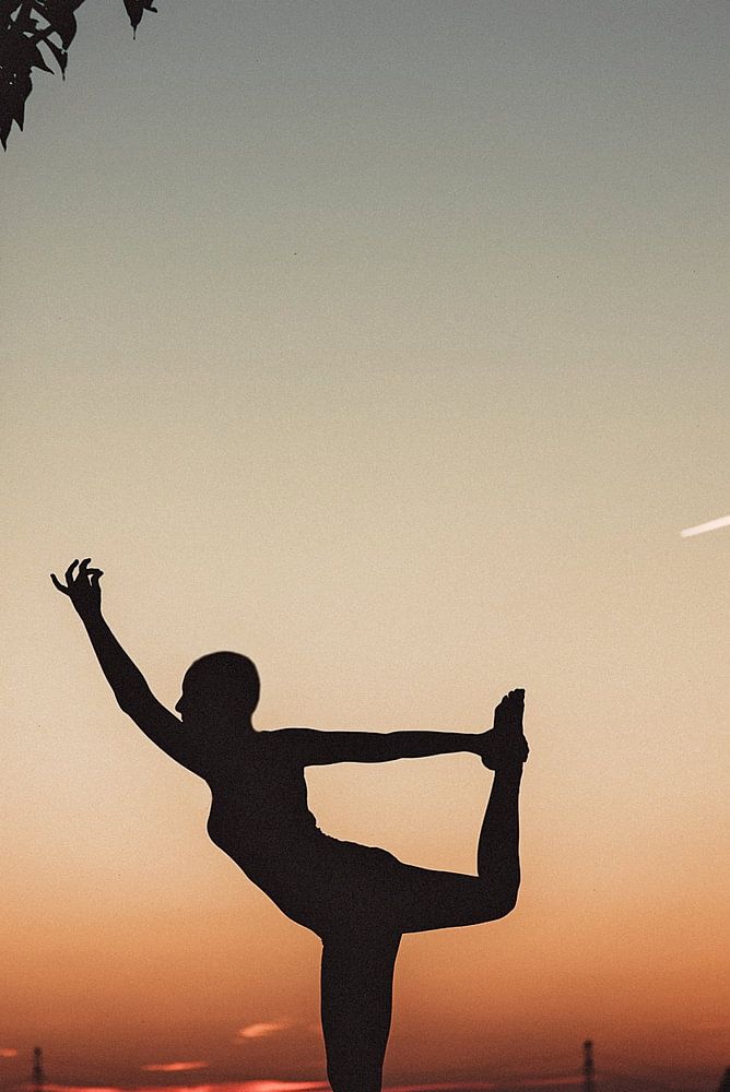 Yoga, Yogaposis während der untergehenden Sonne. Dadurch entsteht ein schönes Silhouettenbild.
