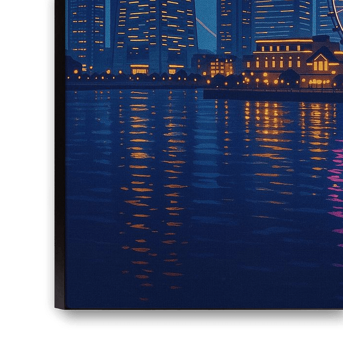 Das Wasser im Vordergrund reflektiert die schimmernden Lichter der Stadt und bildet einen dynamischen Teppich aus Bewegung und Farbe. Jede Welle bringt eine Mischung aus bernsteinfarbenen Reflexionen der Wolkenkratzer und violetten Schimmern aus dem strahlenden Glanz des Riesenrads mit sich. Dieses Zusammenspiel von kühlen Nachttönen und warmen Lichtern verleiht dem Kunstwerk ein atmosphärisches Gleichgewicht, das sowohl beruhigend als auch voller stiller Aufregung ist.