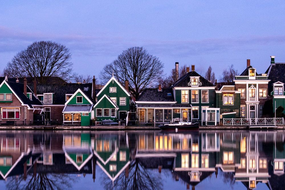 Typisches nordholländisches Dorf am Fluss Zaan. In dieser blauen Stunde spiegeln sich die traditionellen niederländischen Häuser entlang des Flusses im glatten Wasser. Eine Reihe von teilweise hölzernen Häusern sind typisch Zaans-grün gestrichen.