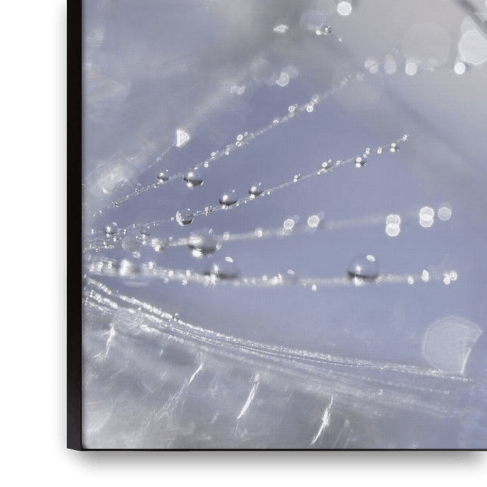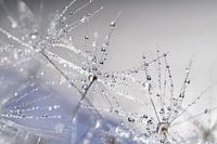 Das Licht verbindet die feinen Linien der Pusteblumenflocken mit Wassertropfen zu einem flüchtigen und zarten Ganzen.