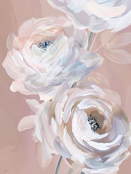 Dieses Kunstwerk zeigt eine enge Komposition aus zwei Ranunkelblüten, die mit weichen, geschichteten Pinselstrichen gemalt sind. Die Blüten entfalten sich in sanften Spiralen und enthüllen zarte Blütenblätter, die sich überlappen und zur Mitte hin kräuseln. Das Gemälde konzentriert sich auf Textur und Bewegung, wodurch die natürliche…
