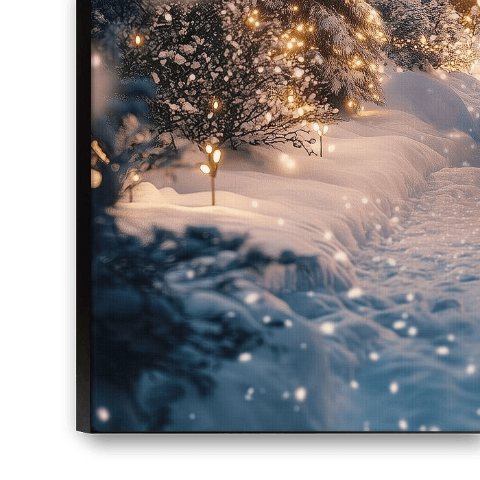 Treten Sie ein in eine zauberhafte Schneelandschaft, in der Magie und Gelassenheit Hand in Hand gehen. Ein dichter Wald, bedeckt mit einer dicken Schicht glitzernden Schnees, strahlt eine heitere Schönheit aus. Überall zwischen den Bäumen sind zarte, funkelnde Lichter, die die Landschaft in einem sanften, warmen Licht erstrahlen lassen.