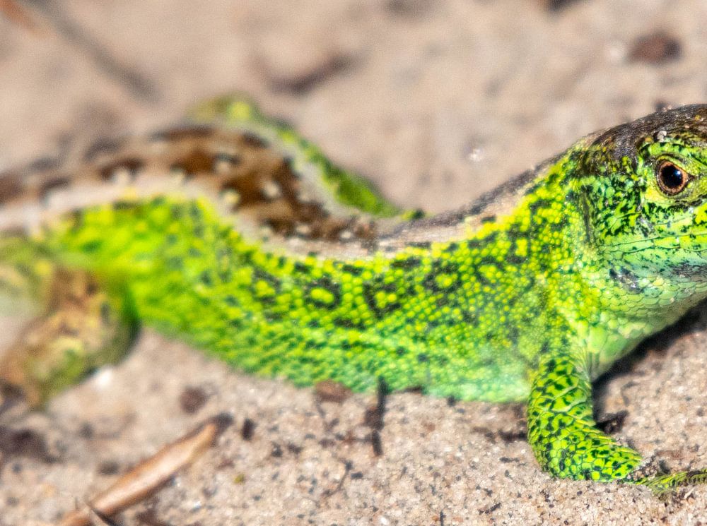 So hellgrün, das würde man in den Niederlanden nicht erwarten. Dennoch findet man sie auf den sandigen Ebenen in den Niederlanden. Sie finden diese wunderschöne Zauneidechse unter anderem in den Dünen der Amsterdamer Wasserversorgung.