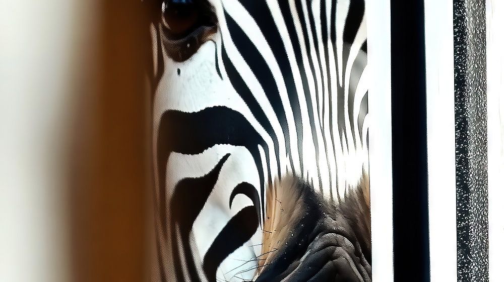 Nahaufnahme eines Zebras, das neugierig durch die Metallgitter seines Geheges blickt. Die eindrucksvollen schwarz-weißen Streifen des Tieres kontrastieren mit den starren, geometrischen Linien des Zauns und erzeugen ein starkes visuelles Bild. Die Szene fängt die Schönheit des Zebras ein, während sie gleichzeitig die Thematik der Wildtiere in Gefangenschaft anspricht und nachdenklich stimmt.