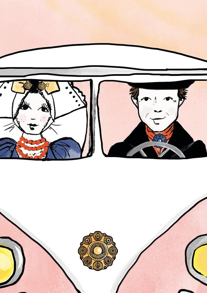 Das Bild zeigt eine malerische Szene mit einem Oldtimerbus am Strand, während die untergehende Sonne die Landschaft in ein warmes Licht taucht. Im Inneren des Busses sitzen ein zeeländisches Mädchen und ein zeeländischer Bauer in traditioneller zeeländischer Tracht. Das Mädchen trägt einen weißen Hut und ein farbenfrohes Kleid mit einer Halskette aus Blutkorallen, während der Bauer eine dunkle Hose, ein weißes Hemd mit orangefarbener Krawatte und einen schwarzen Hut trägt.