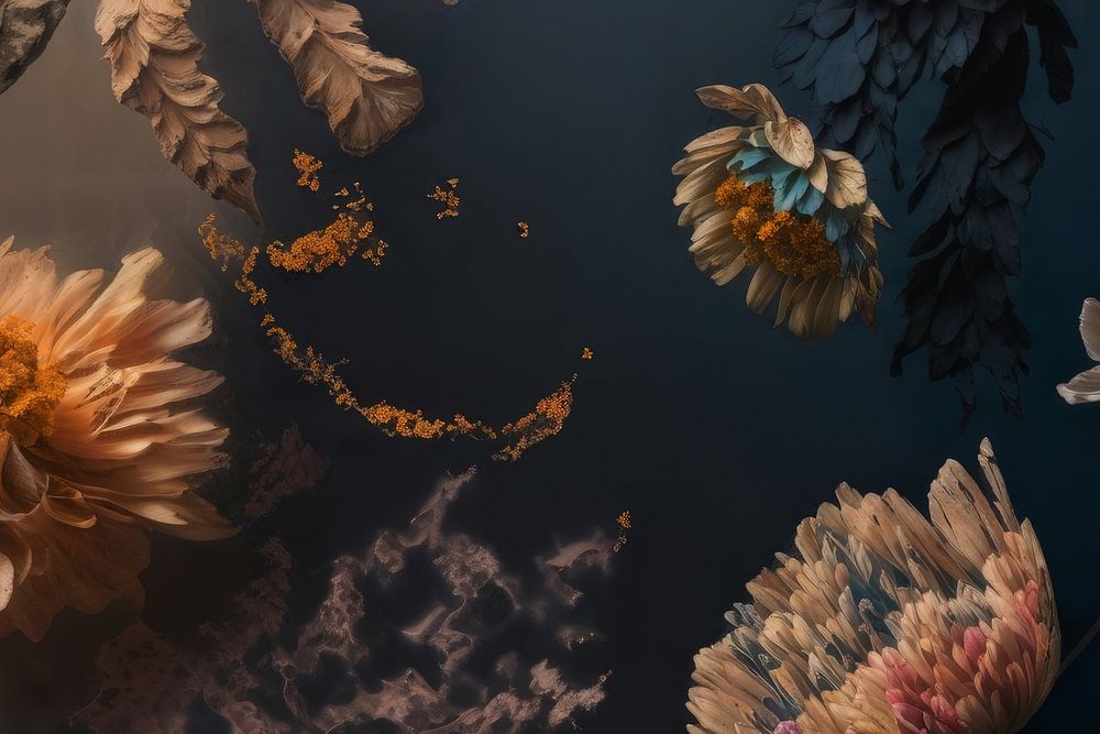 Zeitgenössische "schwebende Blumen". Modernes Stilleben mit in der Luft schwebenden Blumen vor einem taupe/blauen Hintergrund mit Farbverläufen. Dieses Werk ist Teil einer Serie. Um auch die anderen Werke zu sehen, geben Sie "schwebende Blumen" in die Suchleiste meines Shops ein.