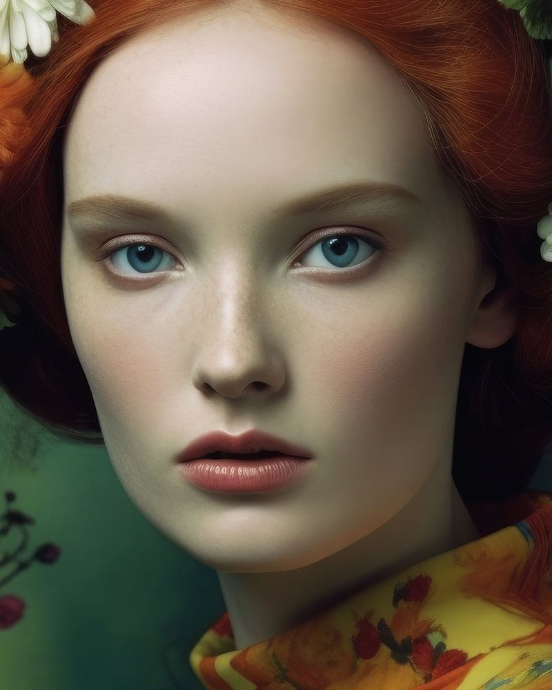 Zeitgenössisches Porträt "Flower power" einer jungen Frau, umgeben von Blumen in hauptsächlich grünen, gelben und orangen Farbtönen. Ein außergewöhnliches Werk für Ihre Wand. Wunderschön im Großformat auf z.B. artframe, Dibond oder Aluminium.