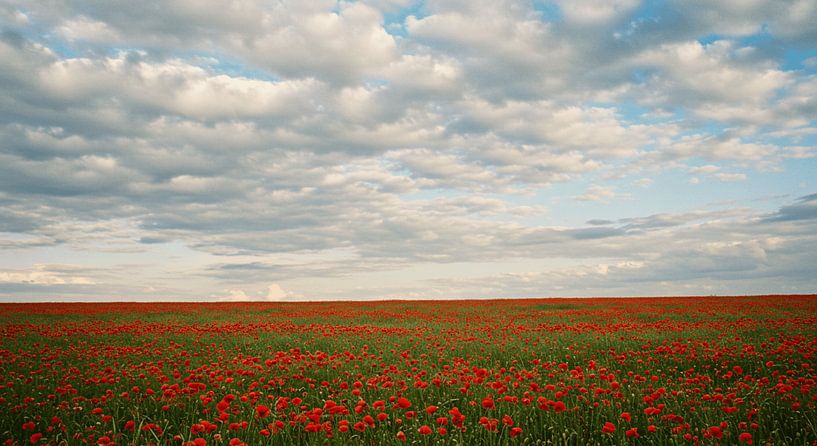 Bestelle das digitale Kunst Bild Zeitlose Mohnblumenwiese unter Wolkenhimmel von ButterflyPix als Reproduktion auf Leinwand, Alu-Dibond, als Poster, Fototapete oder Acrylglasbild.